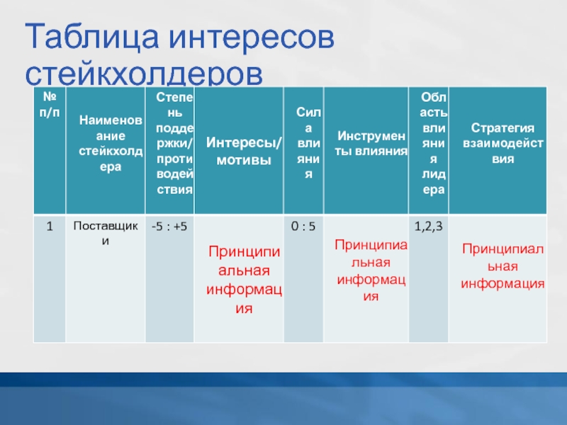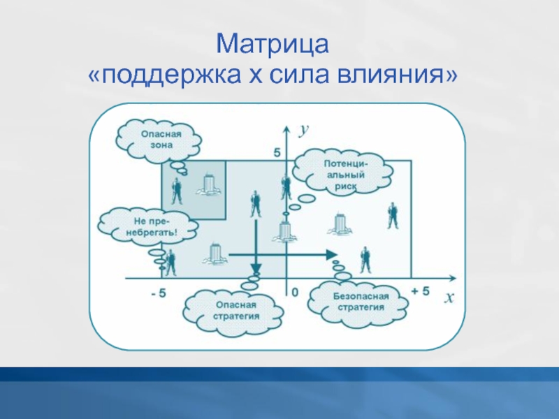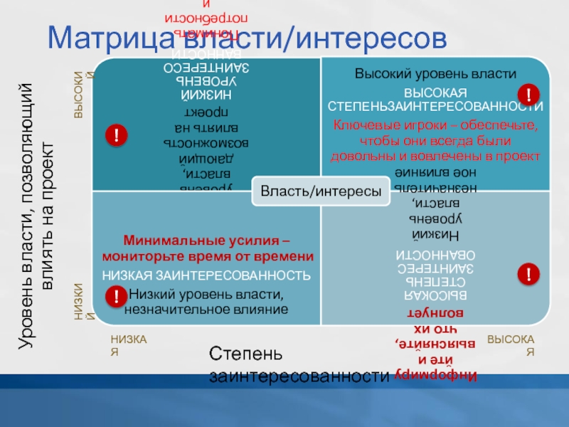 Матрица власти/интересовУровень власти, позволяющий влиять на проектСтепень заинтересованности!!!!НИЗКИЙВЫСОКИЙНИЗКАЯВЫСОКАЯ