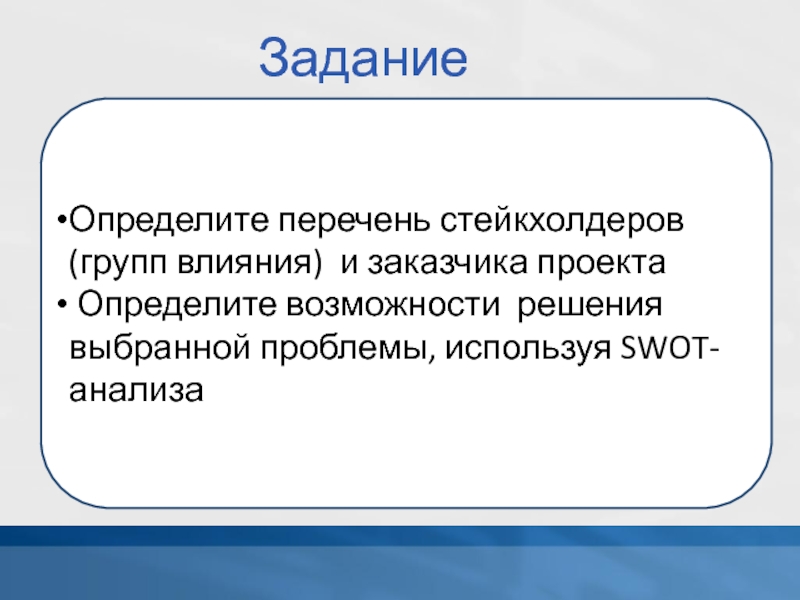 ЗаданиеОпределите перечень стейкхолдеров (групп влияния) и заказчика проекта Определите возможности решения выбранной проблемы, используя SWOT-анализа