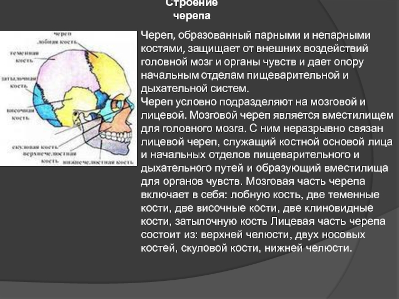 Череп условно подразделяют на мозговой и лицевой. Мозговой череп является вместилищем для головного мозга. С ним неразрывно связан лицевой череп, служащий костной основой лица и начальных отделов пищеварительного и дыхательного путей и образующий вместилища для органов чувств. Мозговая часть черепа включает в себя: лобную кость, две теменные кости, две височные кости, две клиновидные кости, затылочную кость Лицевая часть черепа состоит из: верхней челюсти, двух носовых костей, скуловой кости, нижней челюсти.