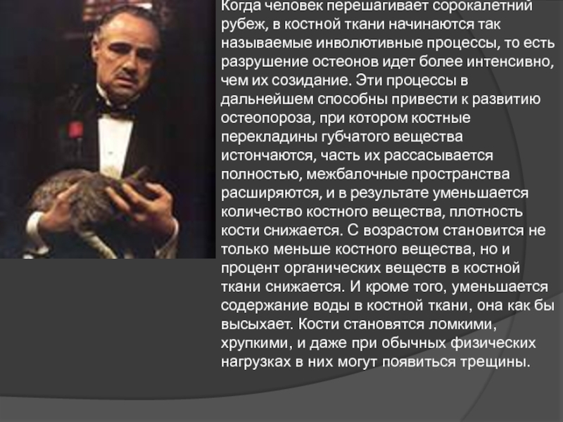 Слайд 6Когда человек перешагивает сорокалетний рубеж, в костной ткани начинаются так