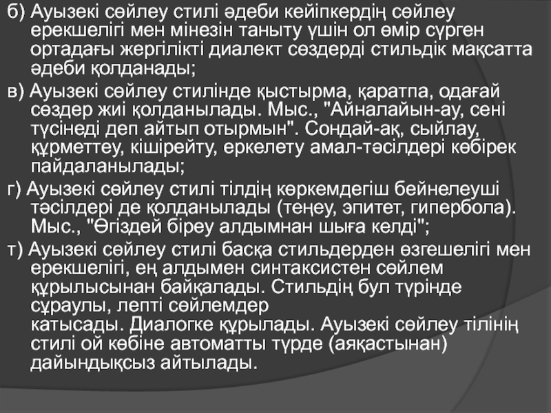 г) Ауызекі сөйлеу стилі тілдің көркемдегіш бейнелеуші тәсілдері де қолданылады (теңеу, эпитет, гипербола). Мыс., "Өгіздей біреу алдымнан шыға келді";