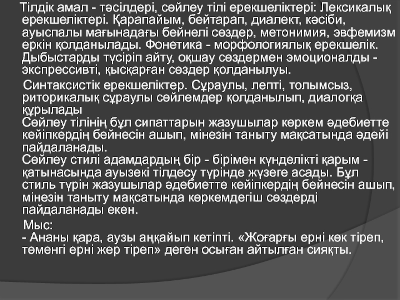 Слайд 7 Тілдік амал - тәсілдері, сөйлеу тілі ерекшеліктері: Лексикалық
