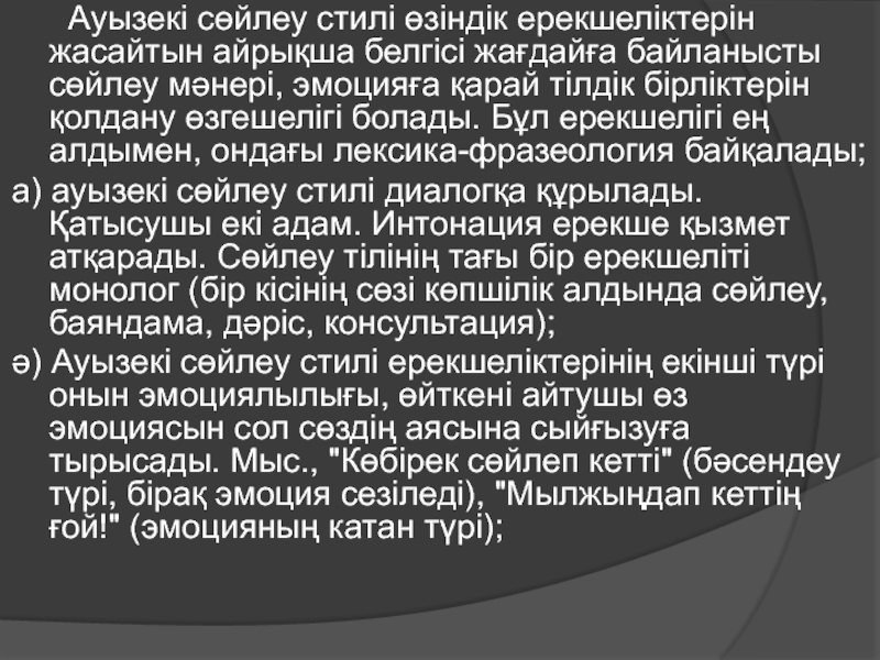 ә) Ауызекі сөйлеу стилі ерекшеліктерінің екінші түрі онын эмоциялылығы, өйткені айтушы өз эмоциясын сол сөздің аясына сыйғызуға тырысады. Мыс., "Көбірек сөйлеп кетті" (бәсендеу түрі, бірақ эмоция сезіледі), "Мылжыңдап кеттің ғой!" (эмоцияның катан түрі);