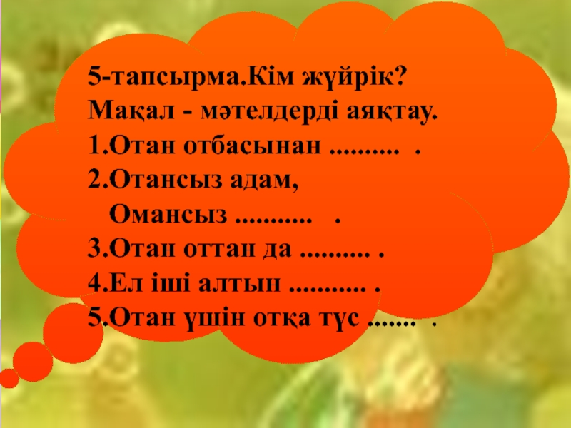 5-тапсырма.Кім жүйрік? Мақал - мәтелдерді аяқтау.