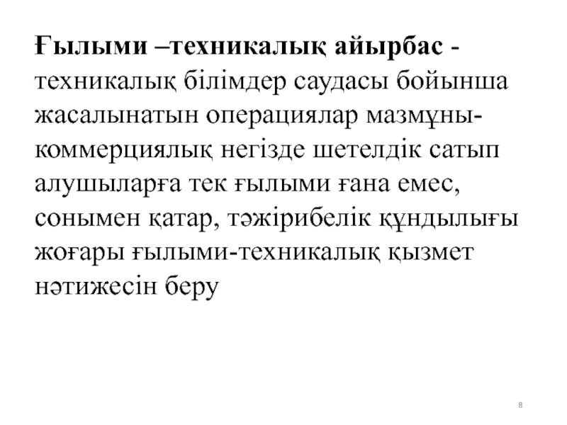 Слайд 8Ғылыми –техникалық айырбас - техникалық білімдер саудасы бойынша жасалынатын операциялар