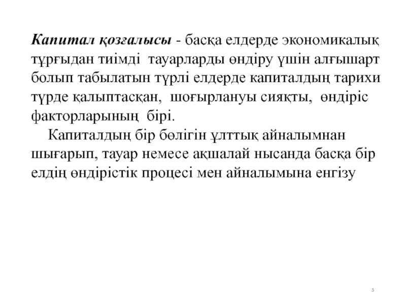 Слайд 5Капитал қозғалысы - басқа елдерде экономикалық тұрғыдан тиімді тауарларды өндіру