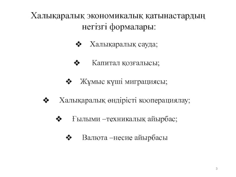 Халықаралық экономикалық қатынастардың негізгі формалары:	Халықаралық сауда; Капитал қозғалысы; Жұмыс күші миграциясы; Халықаралық өндірісті кооперациялау; Ғылыми –техникалық айырбас;