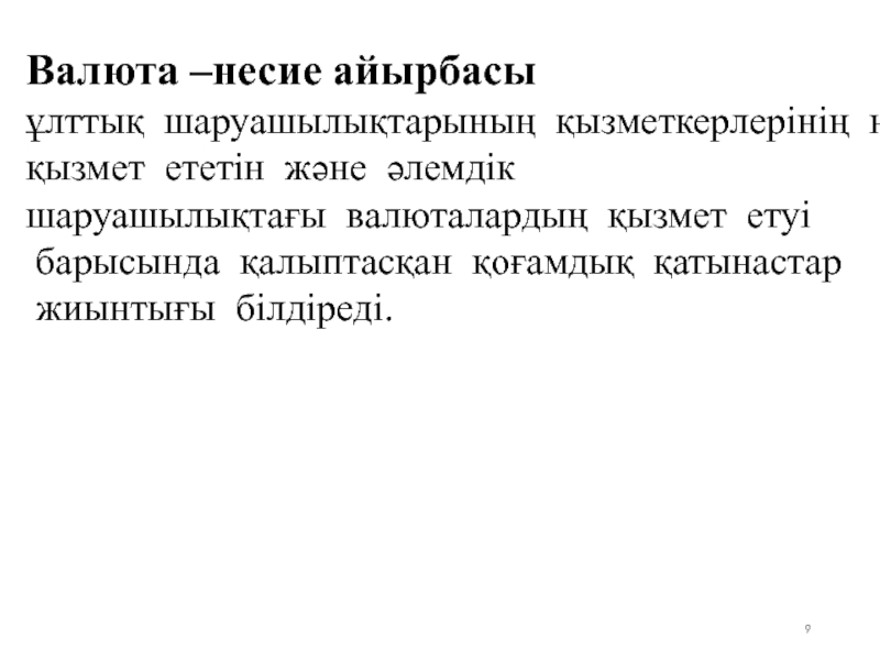 Валюта –несие айырбасыұлттық  шаруашылықтарының  қызметкерлерiнiң  нәтижесiнен  өзара қызмет  ететiн  және  әлемдiк шаруашылықтағы  валюталардың  қызмет  етуi  барысында  қалыптасқан