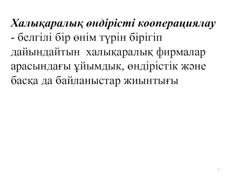 Слайд 7Халықаралық өндірісті кооперациялау - белгілі бір өнім түрін бірігіп дайындайтын