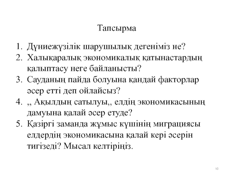 Тапсырма Дүниежүзілік шарушылық дегеніміз не?Халықаралық экономикалық қатынастардың қалыптасу неге байланысты?Сауданың пайда болуына қандай факторлар әсер етті деп