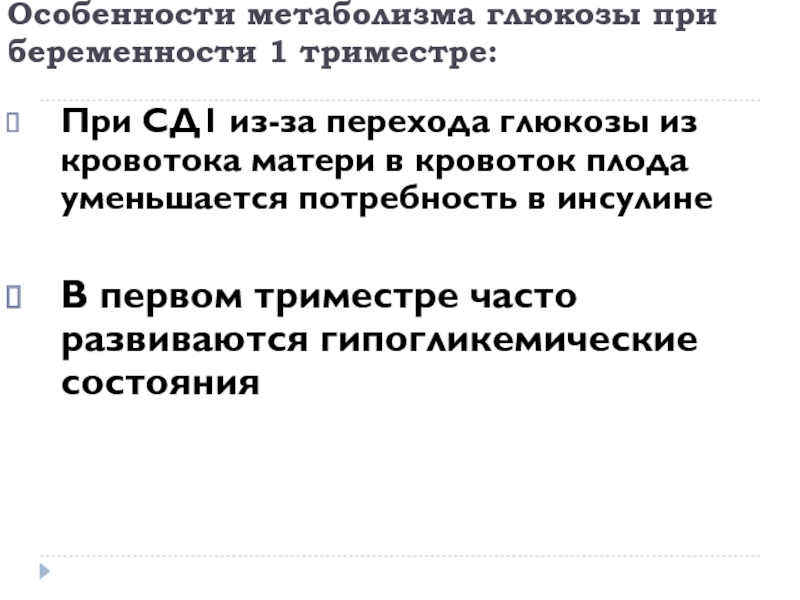 Слайд 8Особенности метаболизма глюкозы при беременности 1 триместре: