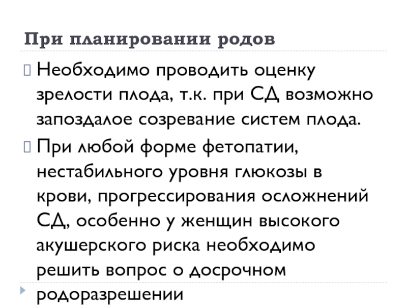 глюкозы в крови, прогрессирования осложнений СД, особенно у женщин высокого акушерского риска необходимо решить вопрос о досрочном родоразрешении