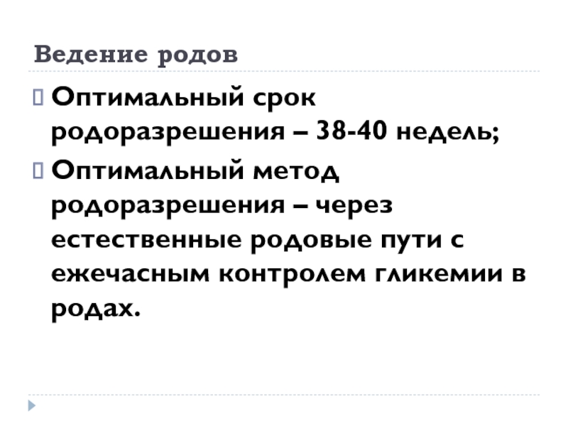 Оптимальный срок родоразрешения – 38-40 недель;