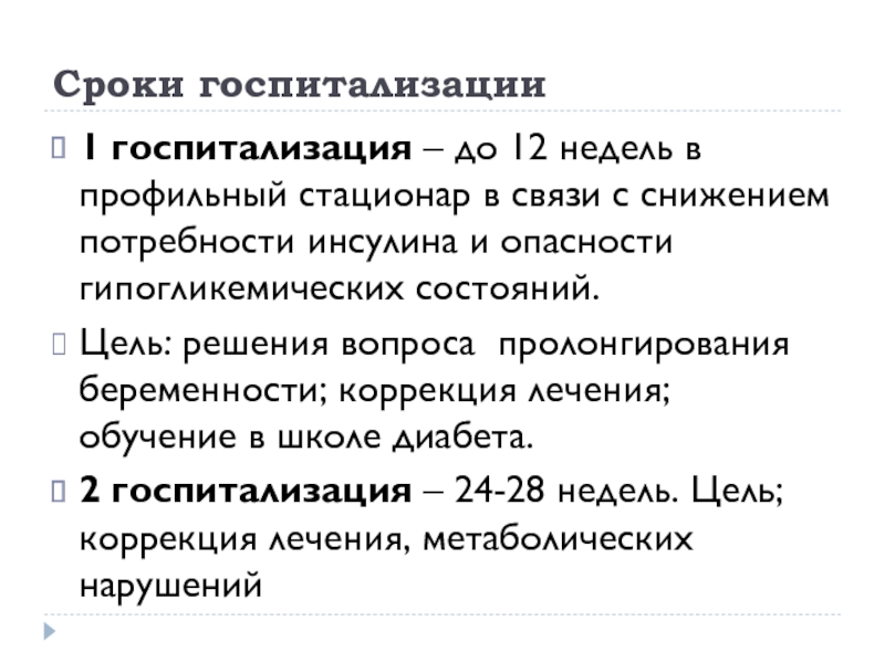 2 госпитализация – 24-28 недель. Цель; коррекция лечения, метаболических нарушений