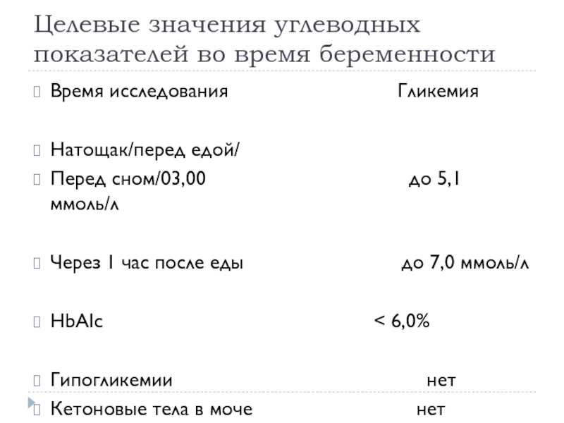 Слайд 13Целевые значения углеводных показателей во время беременности