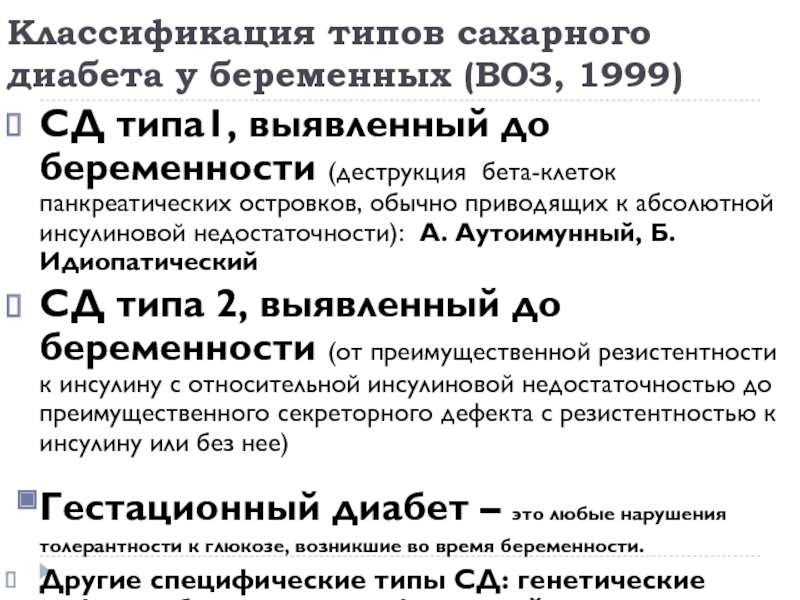 Слайд 7Классификация типов сахарного диабета у беременных (ВОЗ, 1999)