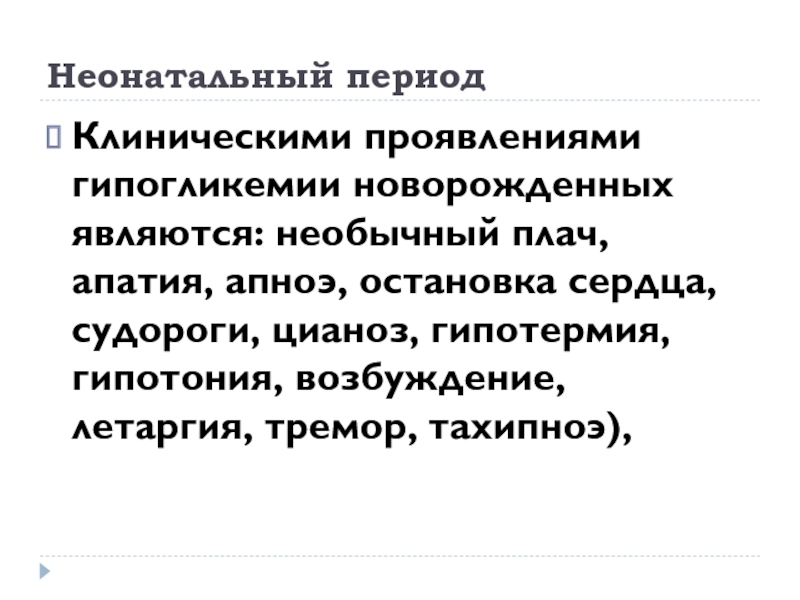 Клиническими проявлениями гипогликемии новорожденных являются: необычный плач, апатия, апноэ,