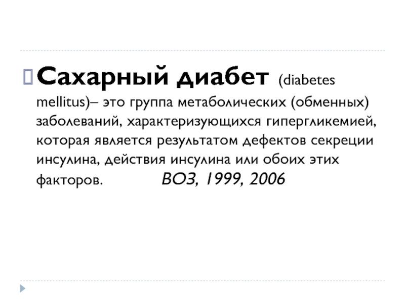 Слайд 5Сахарный диабет (diabetes mellitus)– это группа метаболических (обменных) заболеваний, характеризующихся