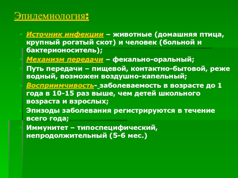 Источник инфекции – животные (домашняя птица, крупный рогатый скот) и