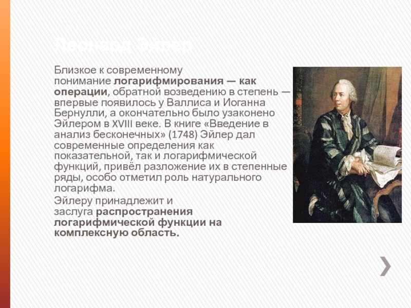 а окончательно было узаконено Эйлером в XVIII веке. В книге «Введение в анализ бесконечных» (1748) Эйлер дал современные определения как показательной, так и логарифмической функций, привёл разложение их в степенные ряды, особо отметил роль натурального логарифма.