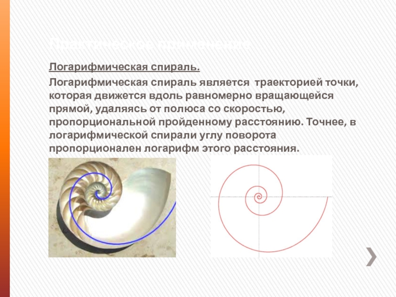Логарифмическая спираль является траекторией точки, которая движется вдоль