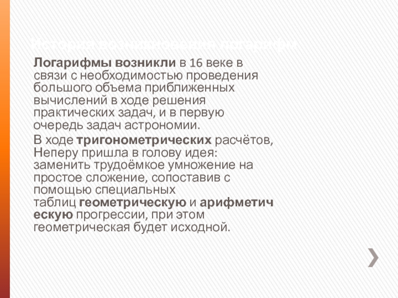 Логарифмы возникли в 16 веке в связи с необходимостью