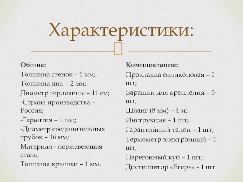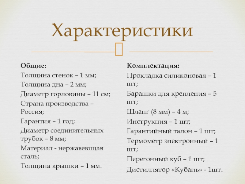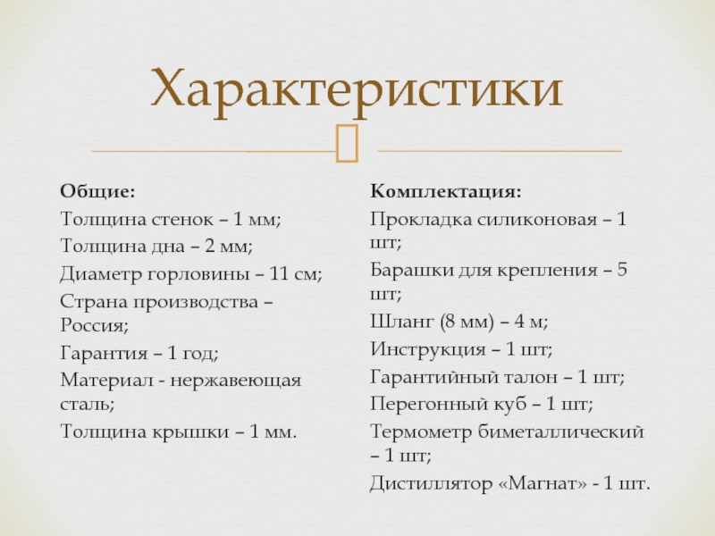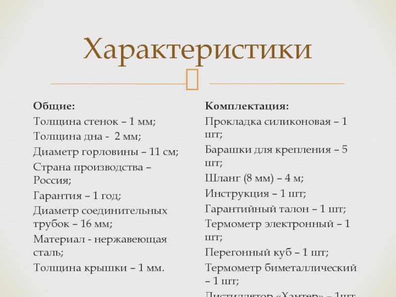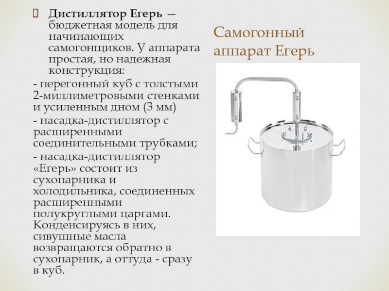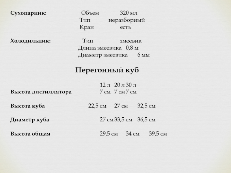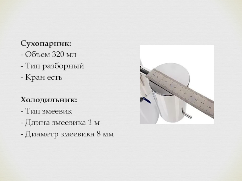 - Материал - нержавеющая сталь, разрешенной для пищевого производства — AISI 304. Металл химически инертен: не окисляется и не влияет на вкус будущего алкоголя.