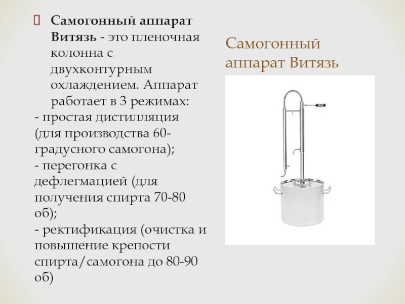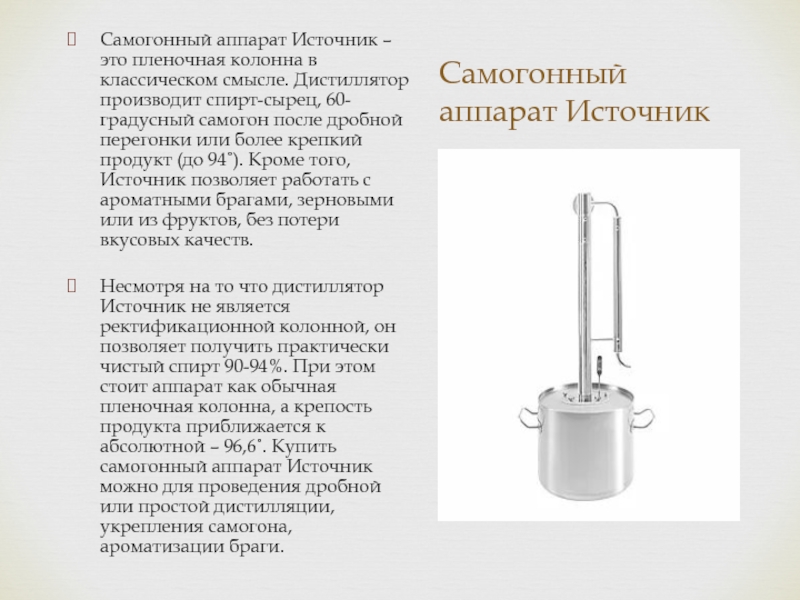 Аппарат Союз работает в разных режимах: от быстрой перегонки pot-still (12 л/час) до ректификации.