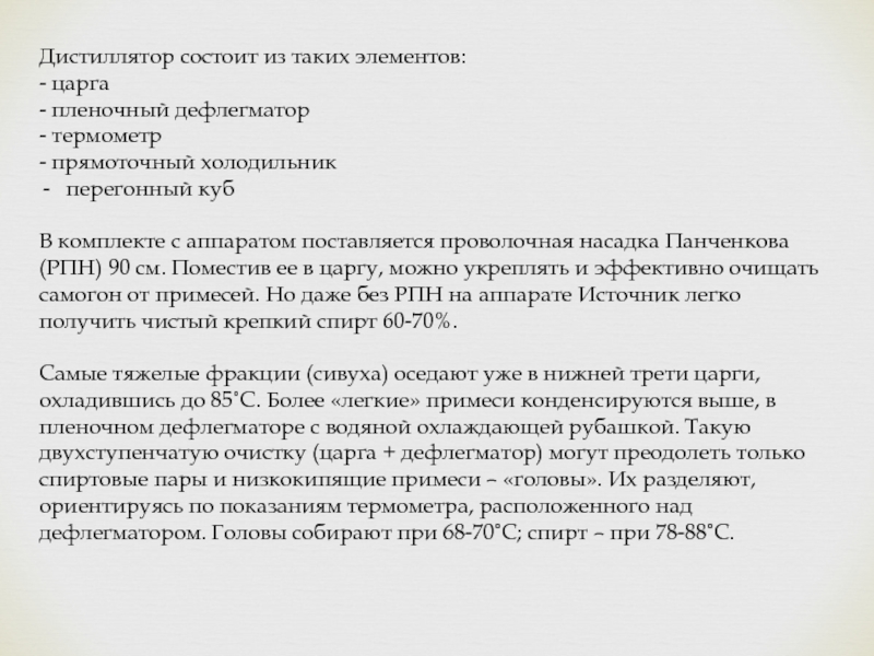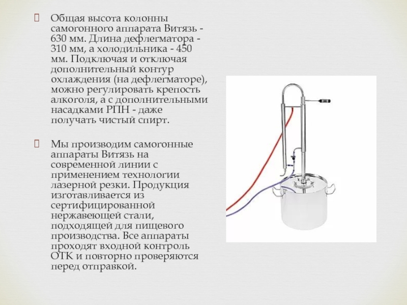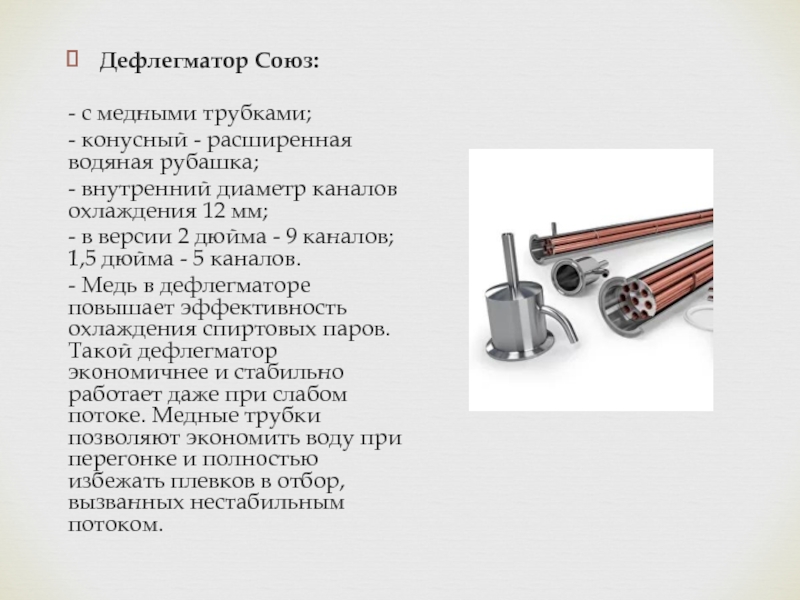 - Дефлегматор и холодильник аппарата Союз сегментарные. Вода в них движется по сложной траектории - повышается КПД охлаждения.