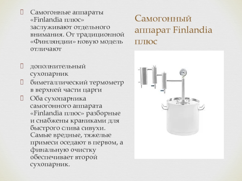 Самогонные аппараты «Finlandia плюс» заслуживают отдельного внимания.