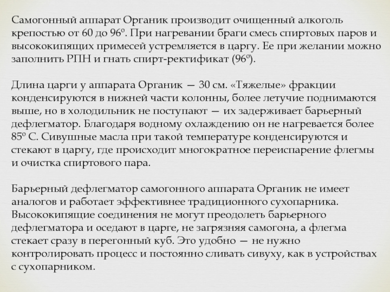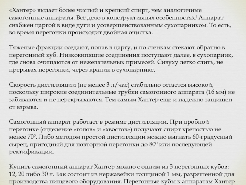системе, бурное вскипание браги и заброс сивухи в отбор. Трубка связи с атмосферой гарантирует стабильную перегонку.
