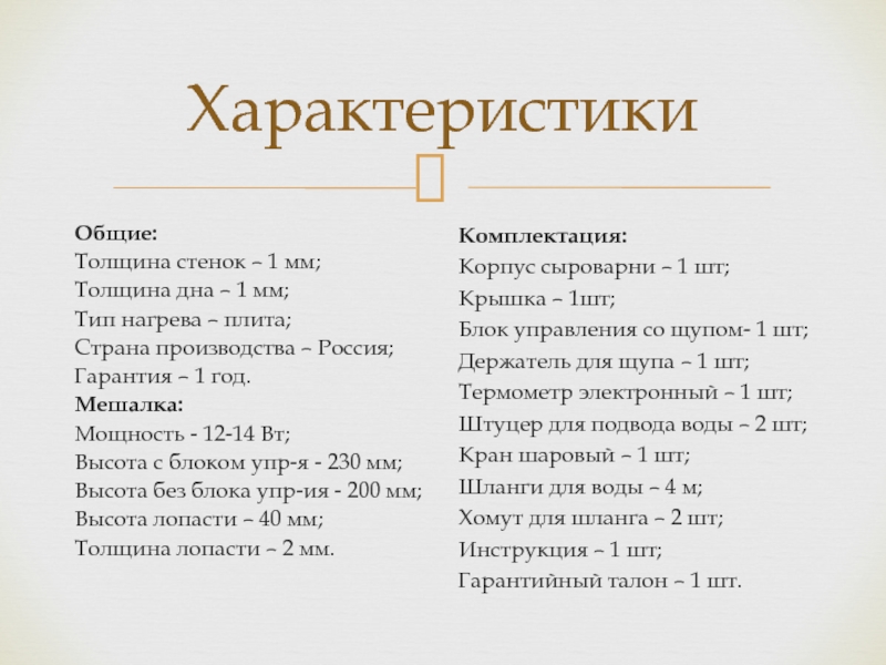 Аппараты выпускаются с ТЭН и без них. В комплект с каждой сыроварней входят блок управления с термометром и таймером, а также электронный термометр для водной рубашки или терморегулятор (для модели с ТЭНом).