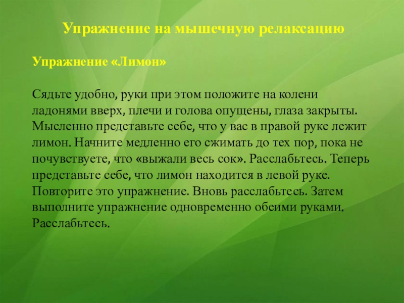 Исходное положение — сидя, закройте глаза. Выдохнуть воздух из легких, затем сделать вдох, считая про себя 1,2,3,4.