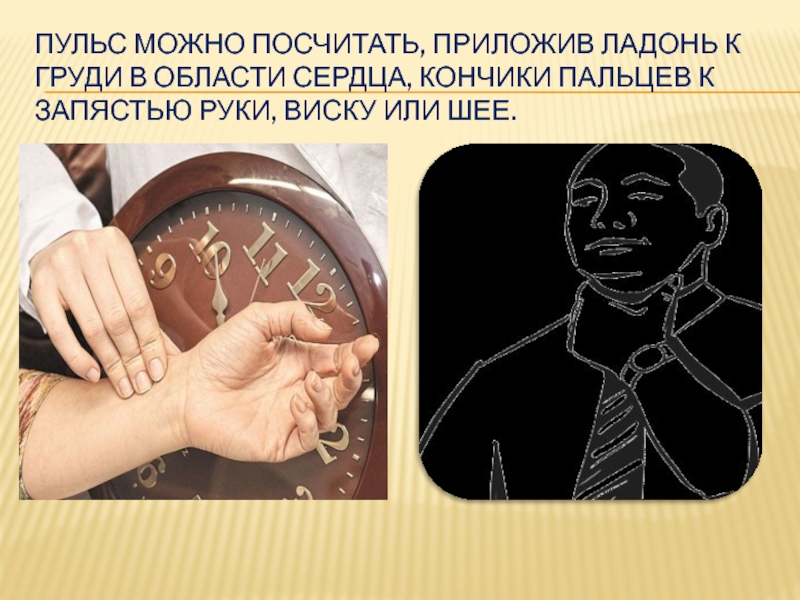 Слайд 7Пульс можно посчитать, приложив ладонь к груди в области сердца,