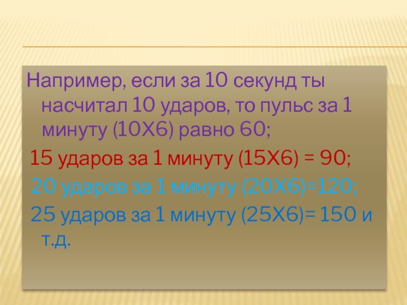 Слайд 9Например, если за 10 секунд ты насчитал 10 ударов, то
