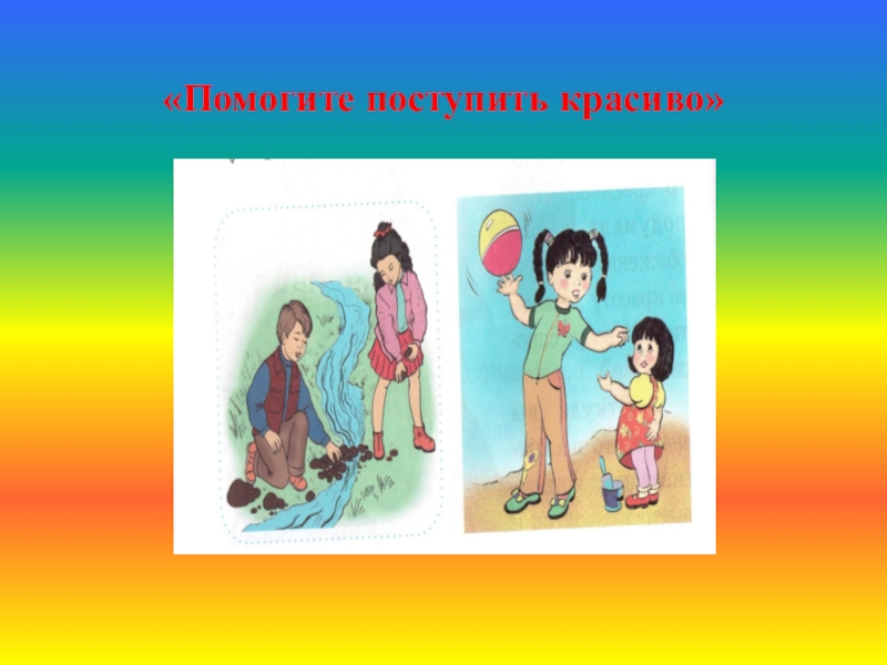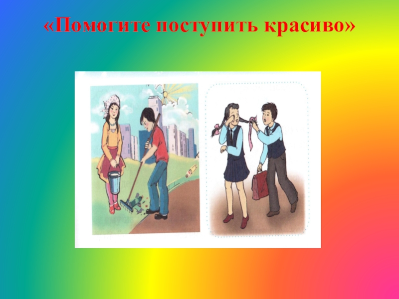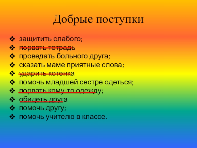 Добрые поступкизащитить слабого;порвать тетрадьпроведать больного друга;сказать маме приятные слова;ударить котенка помочь младшей сестре одеться;порвать кому-то одежду;обидеть другапомочь