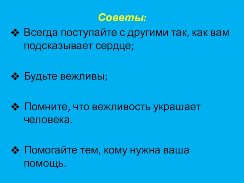 Советы:Всегда поступайте с другими так, как вам подсказывает сердце;Будьте вежливы;Помните, что вежливость украшает человека.Помогайте тем, кому нужна