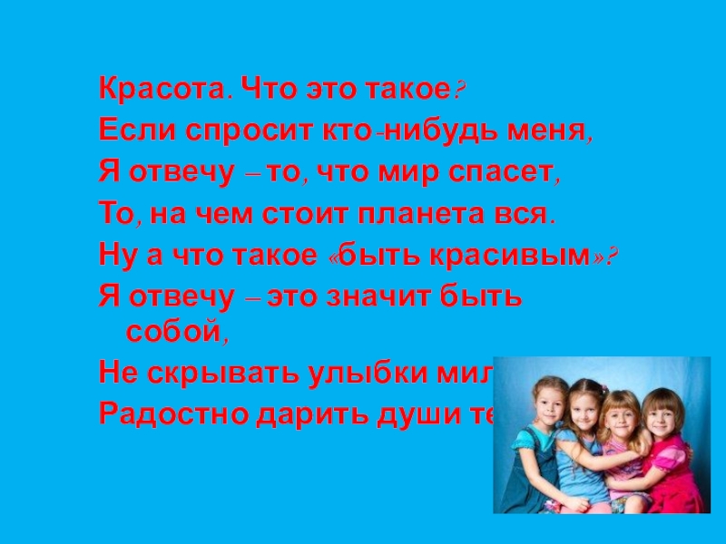 Красота. Что это такое?Если спросит кто-нибудь меня,Я отвечу – то, что мир спасет,То, на чем стоит планета
