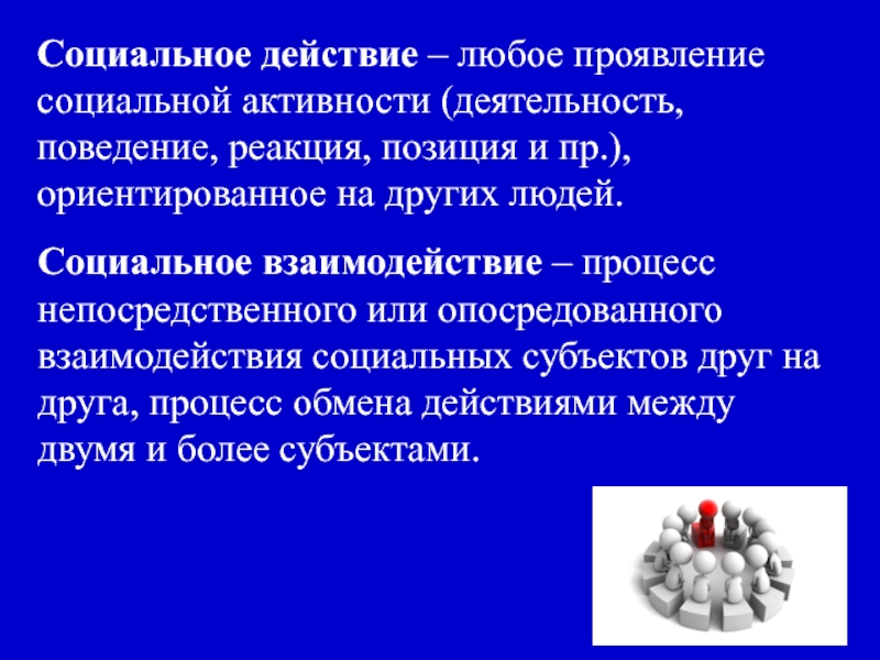 Слайд 15Социальное действие – любое проявление социальной активности (деятельность, поведение, реакция,