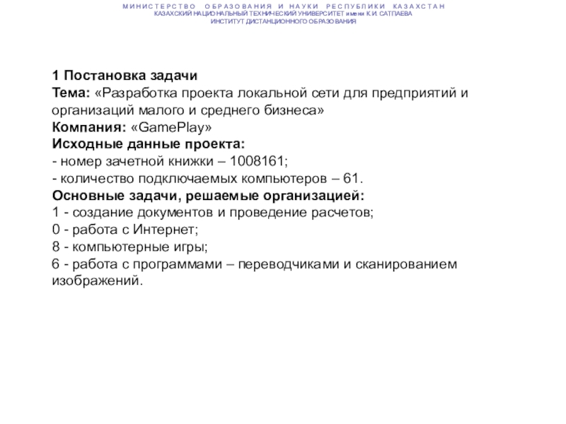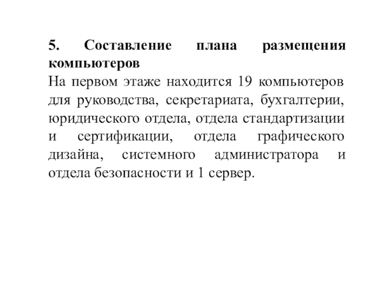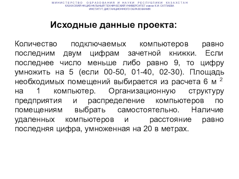 Количество подключаемых компьютеров равно последним двум цифрам зачетной книжки. Если последнее число меньше либо равно 9, то цифру умножить на 5 (если 00-50, 01-40, 02-30). Площадь необходимых помещений выбирается из расчета 6 м 2 на 1 компьютер. Организационную структуру предприятия и распределение компьютеров по помещениям выбрать самостоятельно. Наличие удаленных компьютеров и расстояние равно последняя цифра, умноженная на 20 в метрах.