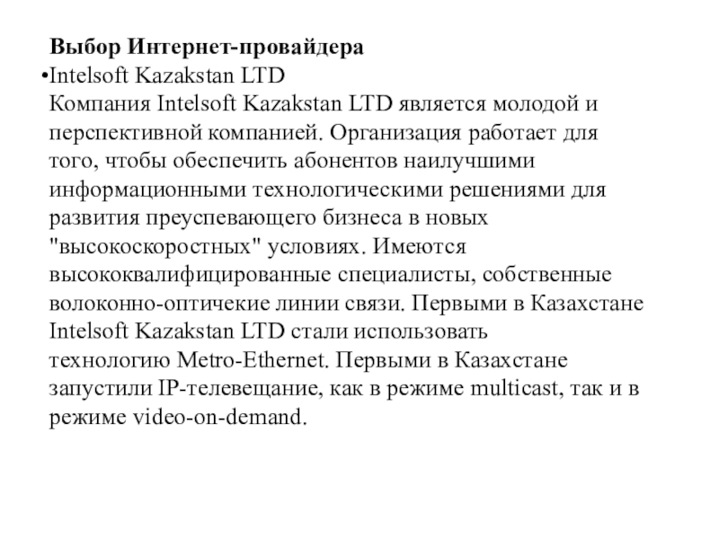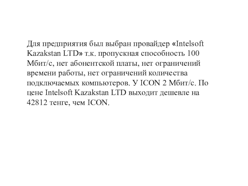 Слайд 21Для предприятия был выбран провайдер «Intelsoft Kazakstan LTD» т.к. пропускная