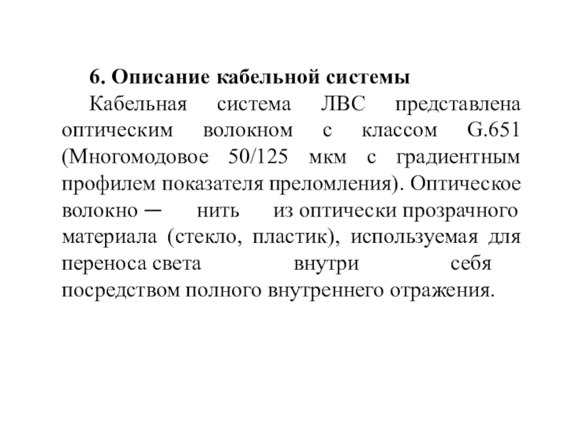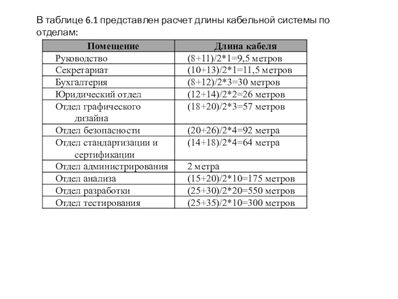 Слайд 28В таблице 6.1 представлен расчет длины кабельной системы по отделам: