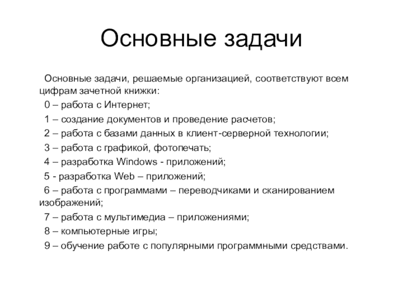 Основные задачи, решаемые организацией, соответствуют всем цифрам зачетной книжки: