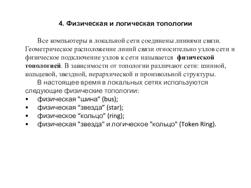 В настоящее время в локальных сетях используются следующие физические топологии: