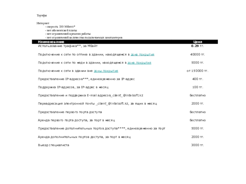 способность 100 Мбит/с, нет абонентской платы, нет ограничений времени работы,