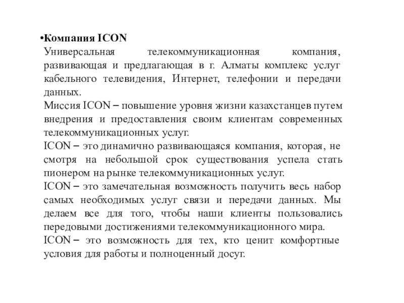 Универсальная телекоммуникационная компания, развивающая и предлагающая в г. Алматы комплекс