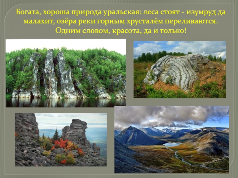 Слайд 2Богата, хороша природа уральская: леса стоят - изумруд да малахит,