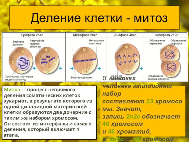В схемах деления гаплоидный набор хромосом обозначают буквой n, а молекул ДНК (т. е. хроматид) — буквой с. Перед буквами указывают число гаплоидных наборов: