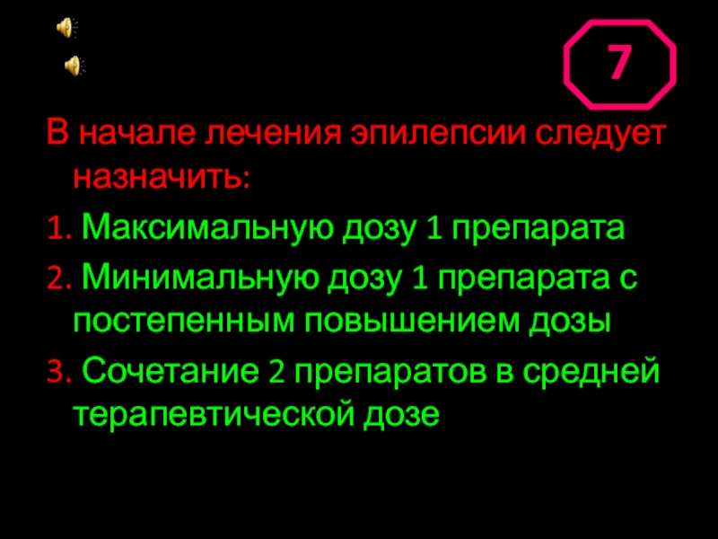Слайд 7В начале лечения эпилепсии следует назначить: