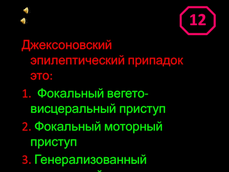 Джексоновский эпилептический припадок это:1. Фокальный вегето-висцеральный приступ2. Фокальный моторный приступ3. Генерализованный судорожный приступ